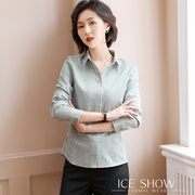 • 宝贝名称: 职业绿色条纹衬衫女长袖职业秋冬新款工作服修身气质竖条纹衬衣OL