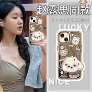 镜面闪钻小狗适用苹果14promax手机壳新款高级感13带支架12卡通可爱11创意硅胶iphone14pro小众女diy全包镜子