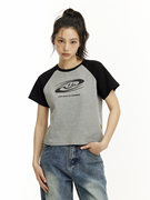 UnderStress黑灰撞色插肩笑脸短袖美式复古辣妹风短T显瘦修身上衣