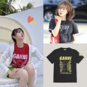 现货 Ganni 22新款 孙胜完宋祖儿同款 印花圆领休闲短袖T恤衫上衣