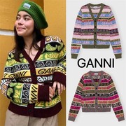 买手店 Ganni 2022秋冬新款 笑脸复古混纺条纹印花针织毛衣开衫