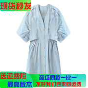 2H2O418大地素新款2023夏季宽松休闲条纹V领短袖气质衬衫洋装女