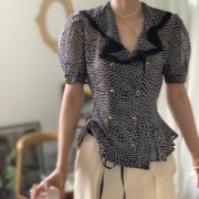 NeeDshop12020春夏新款法式名媛娃娃V领泡泡袖波点上衣+连衣裙